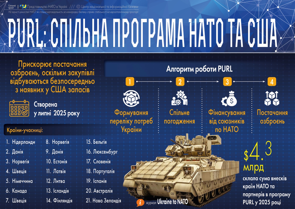Загалом країни НАТО, які увійшли до програми PURL протягом 2025 року спрямували $4,3 млрд на покриття пріоритетних потреб України. Логістика постачань працює цілодобово через хаби в Польщі та Румунії. Заплановано нові поставки на регулярній основі. Крім того, декілька країн вже заявили про намір приєднатися до ініціативи або розширити свої внески.